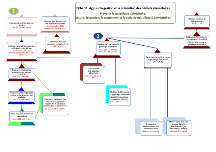 Dans la lignée de la politique de la politique de l’Union européenne (plan d’action intégré en faveur de l’économie circulaire, déc. 2015), et en application de la directive cadre européenne 2008/98/CE, la France a d’abord développé sa politique de lutte contre le gaspillage à partir de documents d’orientation, tel le pacte national de lutte contre le gaspillage alimentaire (actuellement pacte 2017-2020). Depuis la loi n° 2016-138 du 11 février 2016 relative à la lutte contre le gaspillage alimentaire (dite loi « Garot »), le gaspillage alimentaire a fait l’objet de dispositions législatives particulières. La loi n° 2018-938 du 30 octobre 2018 pour l’équilibre des relations commerciales dans le secteur agricole et alimentaire et une alimentation saine, durable et accessible à tous (EGalim) et l’Ordonnance n° 2019-1069 du 21 octobre 2019 relative à la lutte contre le gaspillage alimentaire, ainsi que la loi n° 2020-105 du 10 février 2020 relative à la lutte contre le gaspillage et à l’économie circulaire et l’Ordonnance n°2020-1142 du 16 septembre 2020 relative à la prévention et à la gestion des déchets, sont venues parfaire le dispositif.